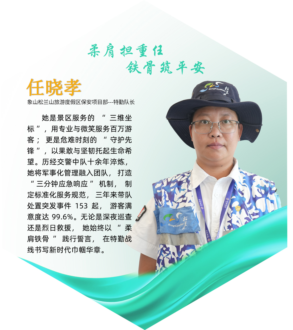 任晓孝,现任象山松兰山旅游度假区保安项目部特勤队长。十一年藏蓝生涯锻造的忠诚本色,让她在从交管协警转战景区安保时依然保持着警魂的铮铮铁骨。肩章虽换,初心未改,她用同样的严谨守护着不同的阵地,将雷厉风行的警队作风化作景区服务的温暖底色,让曾经的“警察...