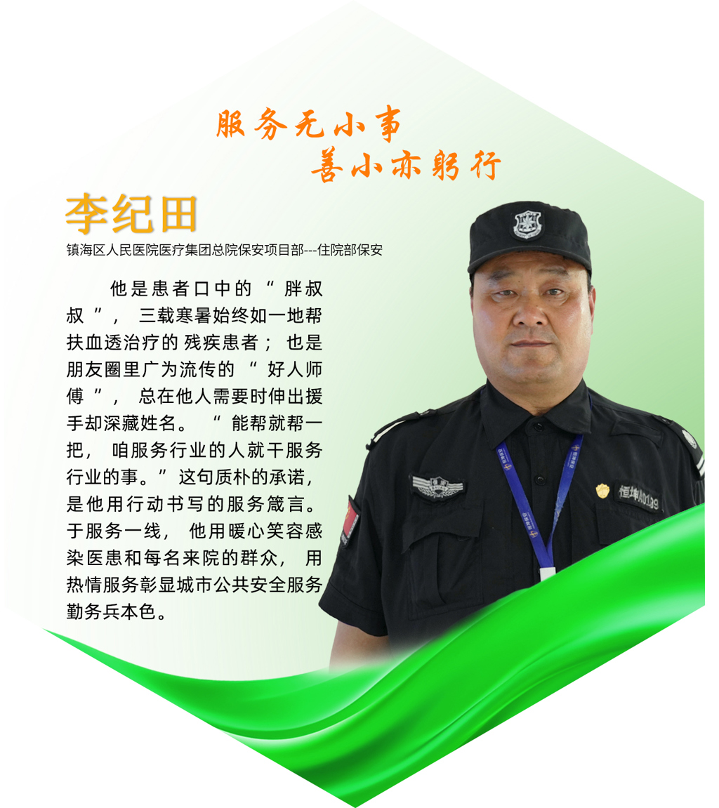 李纪田,现任公司驻镇海区人民医院医疗集团总院保安项目部住院部保安。在岗期间,他认真做好自己的本职工作,坚持高标准、严要求,始终践行“以人为本”的企业价值观。来甬务工近30年的李师傅,人生经历丰富多彩。他做过机修代班,也干过其他工作,但无论在哪个岗位,他都保...