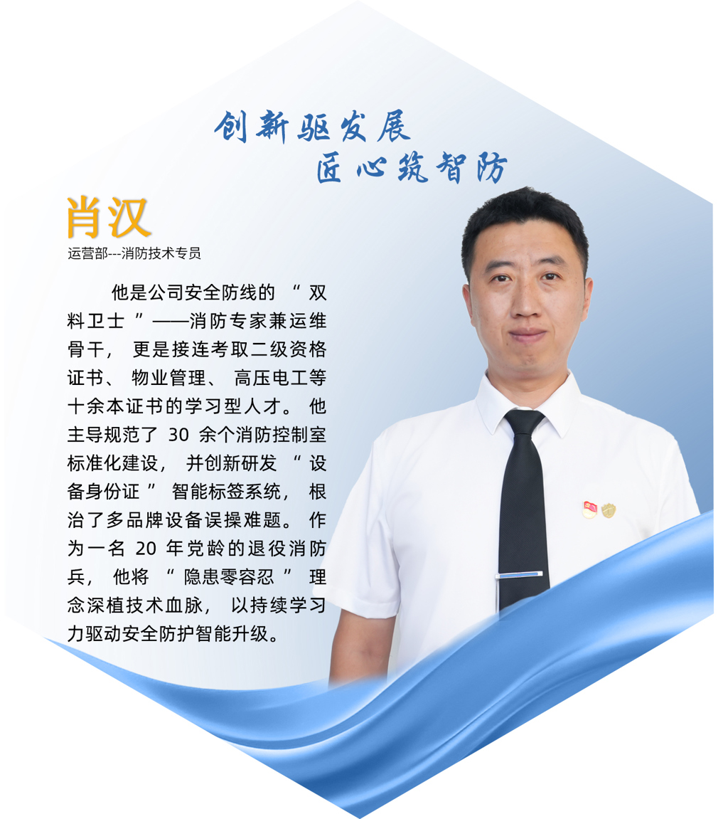 肖汉,现任公司运营部消防技术专员。“一日是兵,一生是兵。”即便脱下军装,那份军人的责任感与执行力早已融入血脉。作为一名拥有20年党龄的老党员,他始终将“守护”视为最重的使命,“召之即来、战之必胜”的忠诚本色从未改变,在他热爱的消防事业中,依然闪耀着光芒。