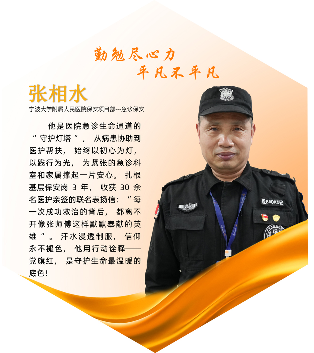 张相水,中共党员,退伍军人,现任公司驻宁波大学附属人民医院保安项目部急诊保安。张相水同志每日默默坚守岗位,用实际行动诠释着责任与担当。在这个没有硝烟却充满挑战的“战场”上,以自己的方式守护着生命的防线。
