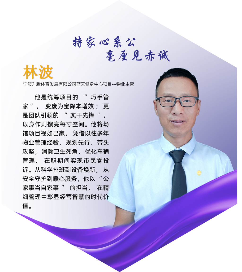林波,现任公司驻宁波市升腾体育蓝天游泳馆项目部物业主管林波。对他而言,这里不仅仅是工作场地,而是他倾注心血、用心经营的“家”。正是这份深厚的“家”情怀,让林波日复一日将安全与服务落到实处,带领团队让整个项目焕然一新。
