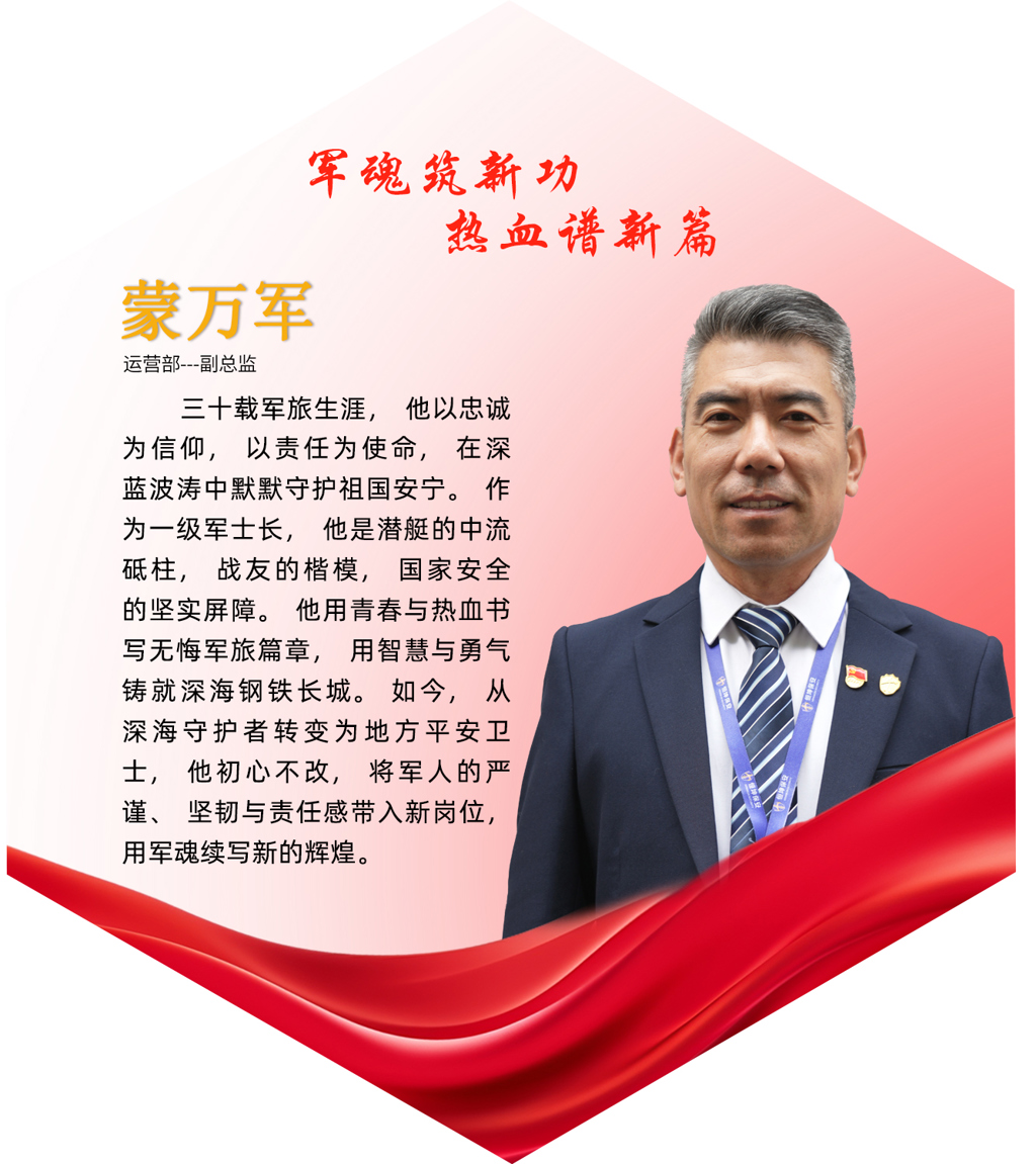 蒙万军,中共党员,现任公司运营部副总监,分管金融商务总队。三十载春秋,他始终以非凡的毅力与奉献精神书写着人生华章。昔日,他作为中国海军潜艇兵一级军士长,深潜海底,守护国家海疆;今朝,他转战地方,初心如磐,将军人的严谨作风、坚韧品格与责任担当融入新的工作岗...